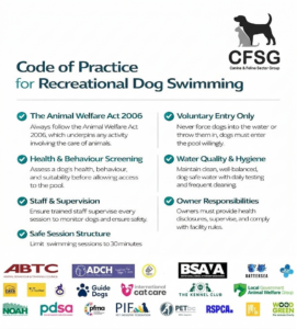 CFSG has also just published Guidance for Recreational Pools to provide a clear framework to support high standards of safety, welfare and professionalism across the growing dog swimming sector. The guidance covers key operational areas including dog suitability screening, staff competence and supervision, session structure, water quality management, facility design, legal compliance, record-keeping and environmental considerations.